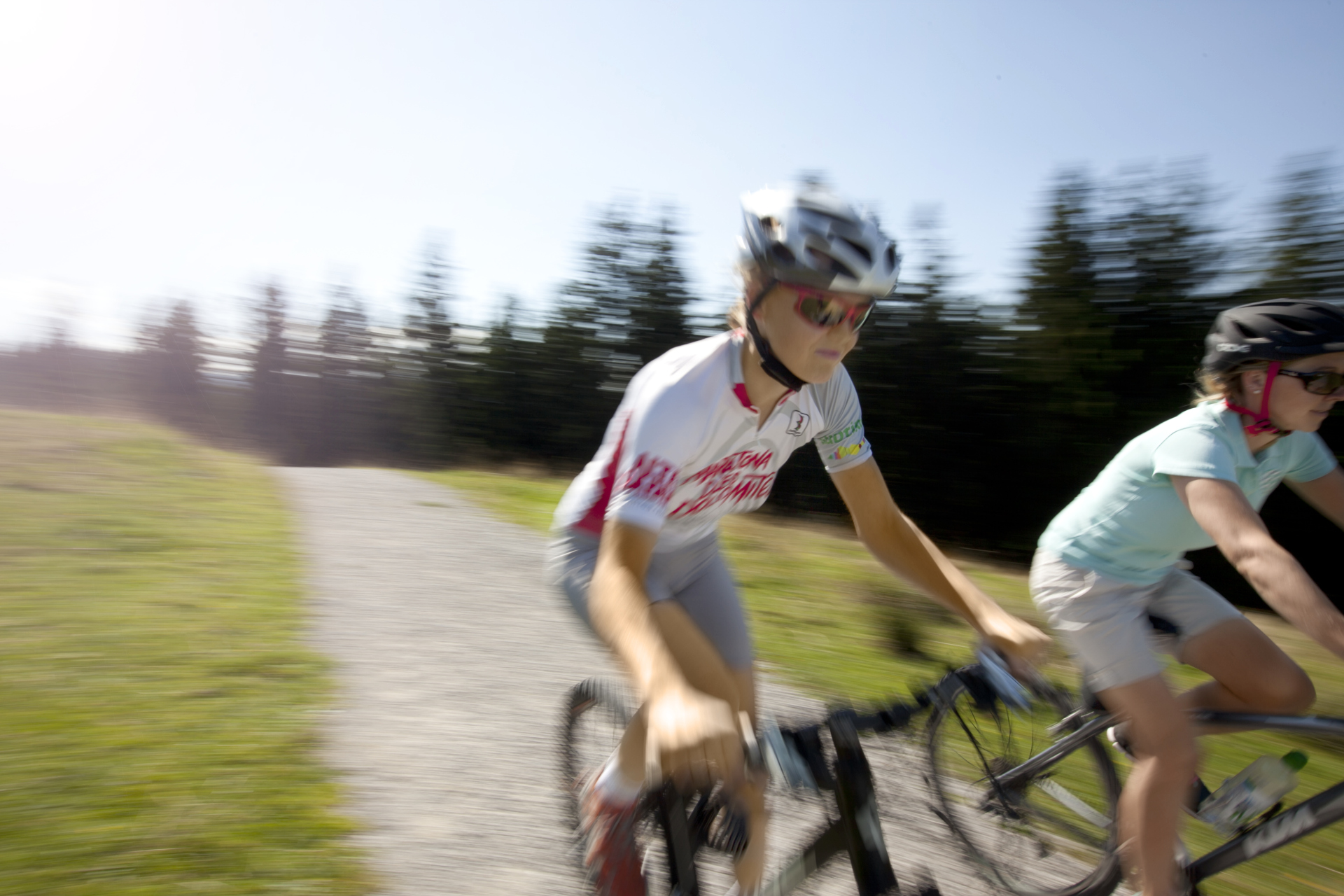 Während die Laufstrecke danach den Wirtschaftsweg nach links verlässt, folgt man mit dem Bike dem Forstweg weiter leicht bergan.